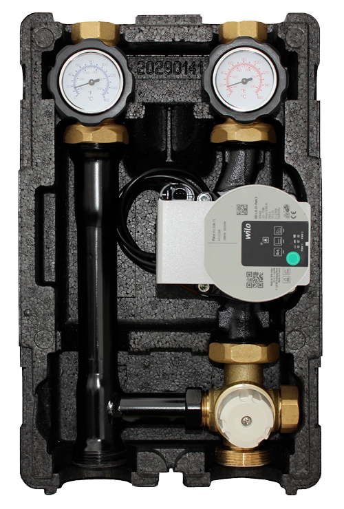 Hochwertige Absperrventile mit eingebauter Schwerkraftbremse und Thermometern. Komplett Anschlussfertig mit Wärme-Dämmschale aus EPS.